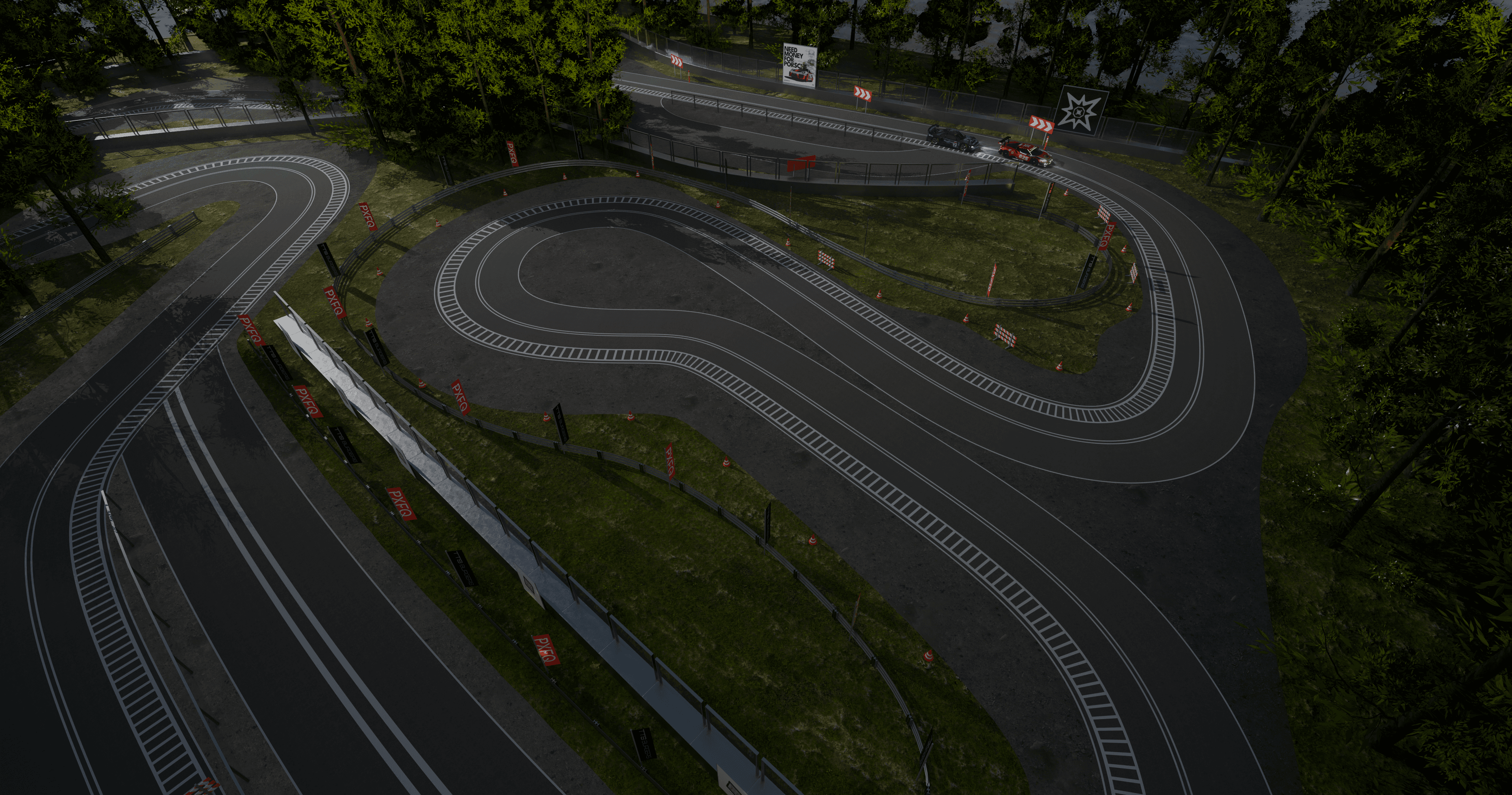 A cinematic race film built around two cars carrying custom PixelFreq liveries, surrounded by branded track props and environmental graphics.